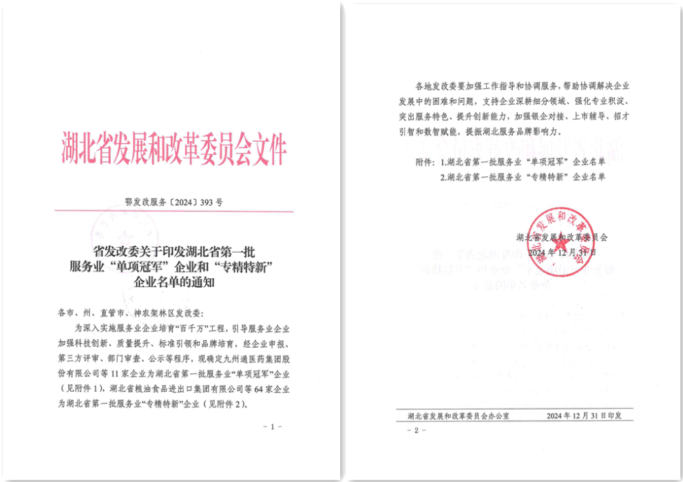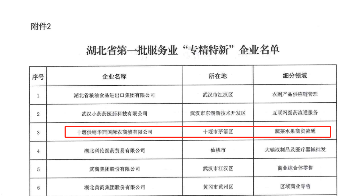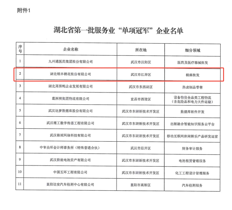 2024年12月31日,湖北省發展和改革委員會發布《關于印發湖北省第一批服務業“單項冠軍”企業和“專精特新”企業名單的通知》,銀豐集團旗下兩家出資企業分别斬獲殊榮。其中湖北銀豐棉花股份有限公司榮獲湖北省第一批服務業“單項冠軍”企業稱号;十堰供銷華西國際農商城有限公司榮獲湖北省第一批服務業“專精特新”企業稱号。